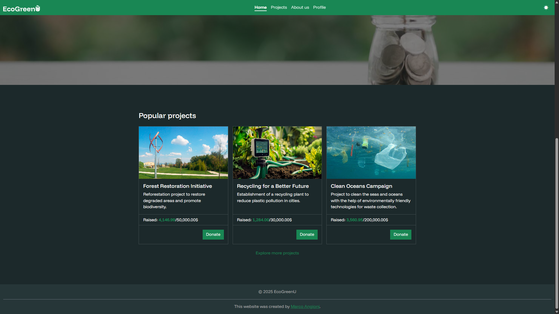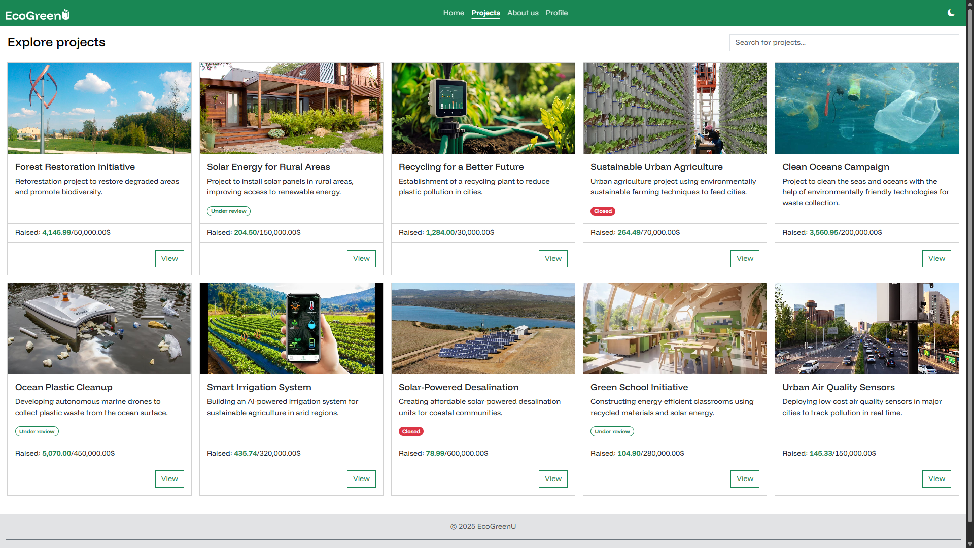 EcoGreenU is a fictional crowdfunding platform (inspired by GoFundMe) that allows users to create an account, create and manage projects, and donate funds to other ecological initiatives. EcoGreenU is the result of a school assignment given to learn how to manage database connections and query data from our web-based applications.
